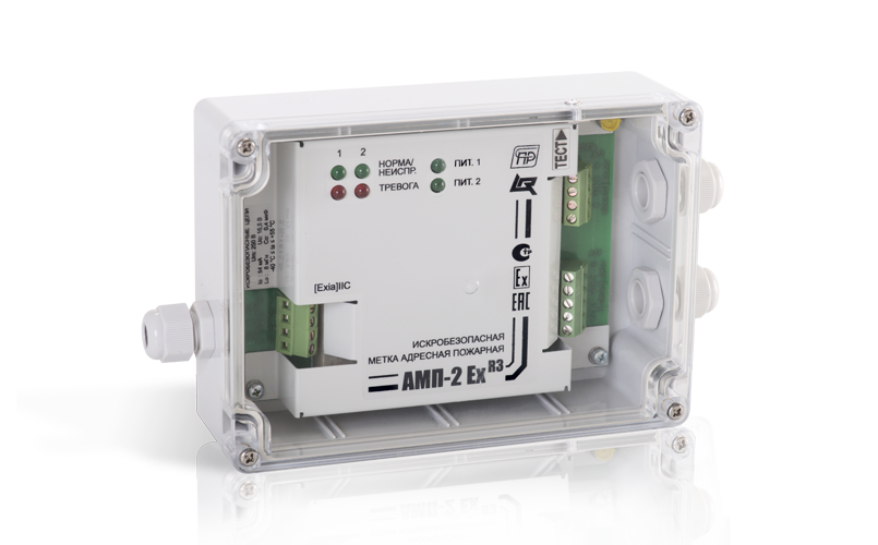 Адресная метка искробезопасная АМП-2 Ex прот.R3 предназначена для контроля за состоянием пожарных зон во взрывоопасных помещениях и зонах защищаемого объекта посредством двух искробезопасных шлейфов сигнализации. Работает в составе адресной системы под управлением приемно-контрольного прибора Рубеж, обеспечивающим в АЛС обмен в протоколе R3.