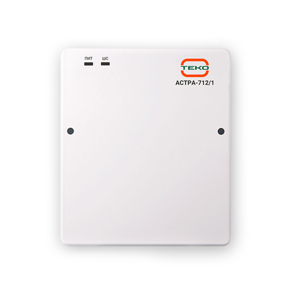 Панель управления «Теко» «Астра-712/1» контролирует состояние охранного или технологического шлейфа сигнализации (ШС) с подключенными охранными или технологическими извещателями, управляет средствами оповещения, отправляет тревожные уведомления на ПЦН через релейный выход, передает информацию по линии расширения на релейные блоки «Астра-822», блоки индикации «Астра-861», радиопередающее устройство УОО «Астра-Y», обеспечивает питанием активные извещатели и др.