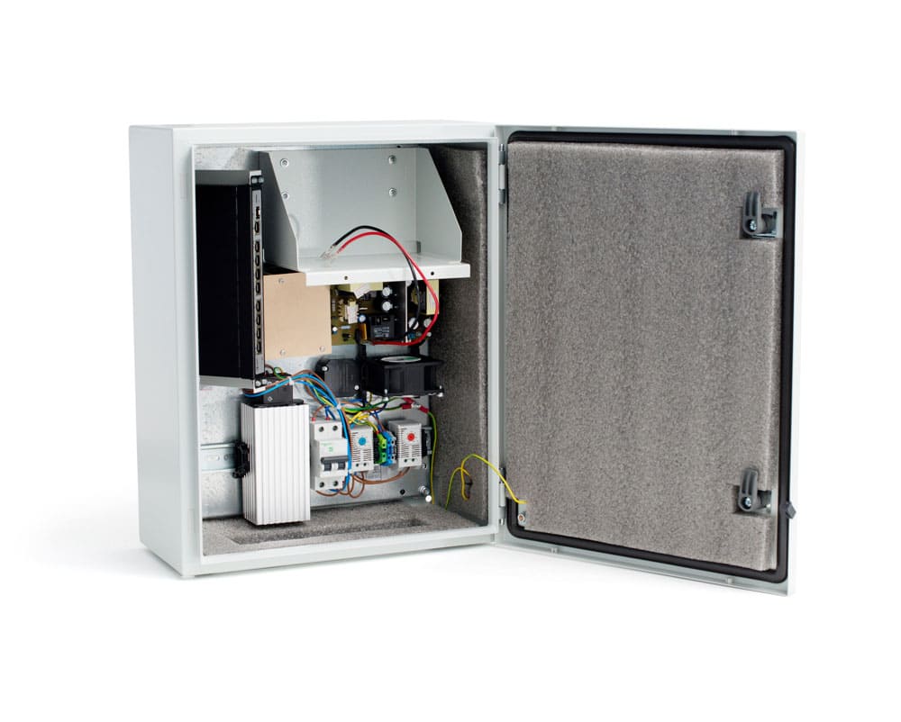 Неуправляемый бесперебойный PoE-коммутатор «Бастион» Skat PoE-UPS-8Е-1G-1S исп.5 рассчитан на круглогодичную уличную эксплуатацию: корпус соответствует стандарту защиты от пыли и влаги IP65, от механических воздействий — коду IK10, рабочие температуры — –45 ºC... +50 ºC, предусмотрены гермовводы, грозозащита (4 кВ), система термостабилизации, состоящая из термостата и нагревателя, поддерживающая температуру в корпусе выше +5 ºС.