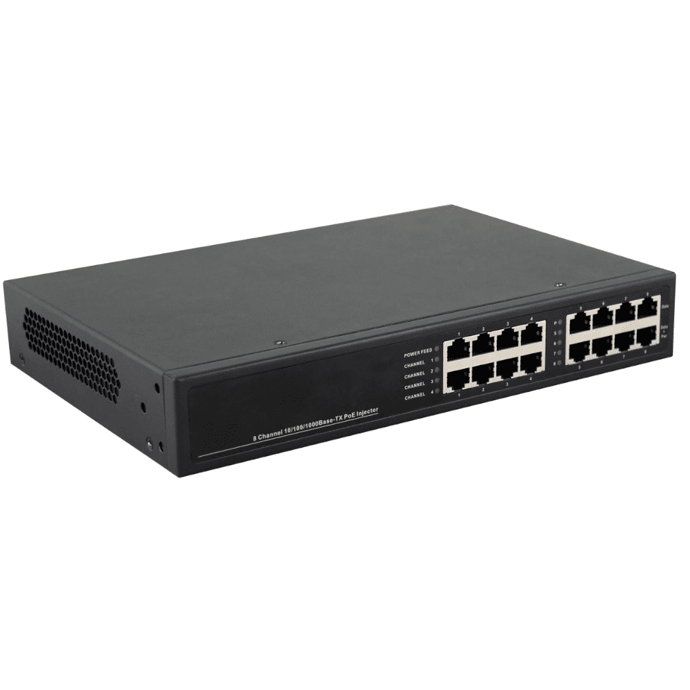 PoE-инжектор Gigabit Ethernet на 8 портов. Соответствует стандартам PoE IEEE 802.3af/at. Автоматическое определение PoE устройств. Мощность PoE на порт - до 30W. Суммарная мощность PoE - до 150W. Вх. - 8 x RJ45 (10/100/1000 Base-T), вых. - 8 x RJ45(10/100/1000 Base-T, PoE, IEEE 802.3af/at). Питание: AC100-240V. Встроенный БП. Монтаж в 19" стойку, крепление в комплекте. Размеры(ШхВхГ): 270x44x180мм. Рабочая температура: -10...+45 гр. C