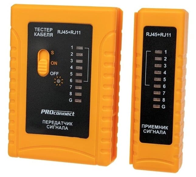 Тестер PROconnect 12-1006-4 витой пары и телефонного кабеля поставляется в корпусе из ударопрочного пластика, состоит из передатчика и приемника. Предусмотрена LED-индикация на приемнике и передатчике.