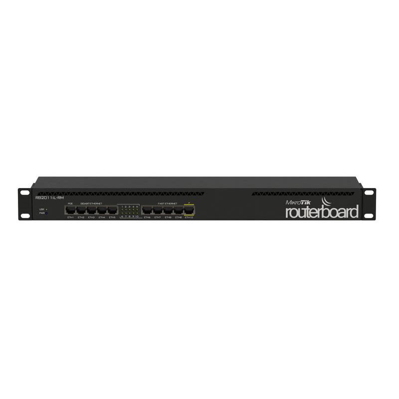 RB2011L-RM является базовой моделью с пятью портами Gigabit Ethernet, пятью портами Ethernet, разъемом питания и с поддержкой PoE. Поставляется в 1U 19" металлическом корпусе.
