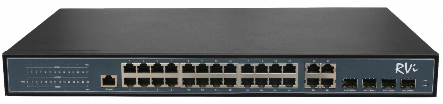 Общее количество портов: 28; Количество портов PoE: 24