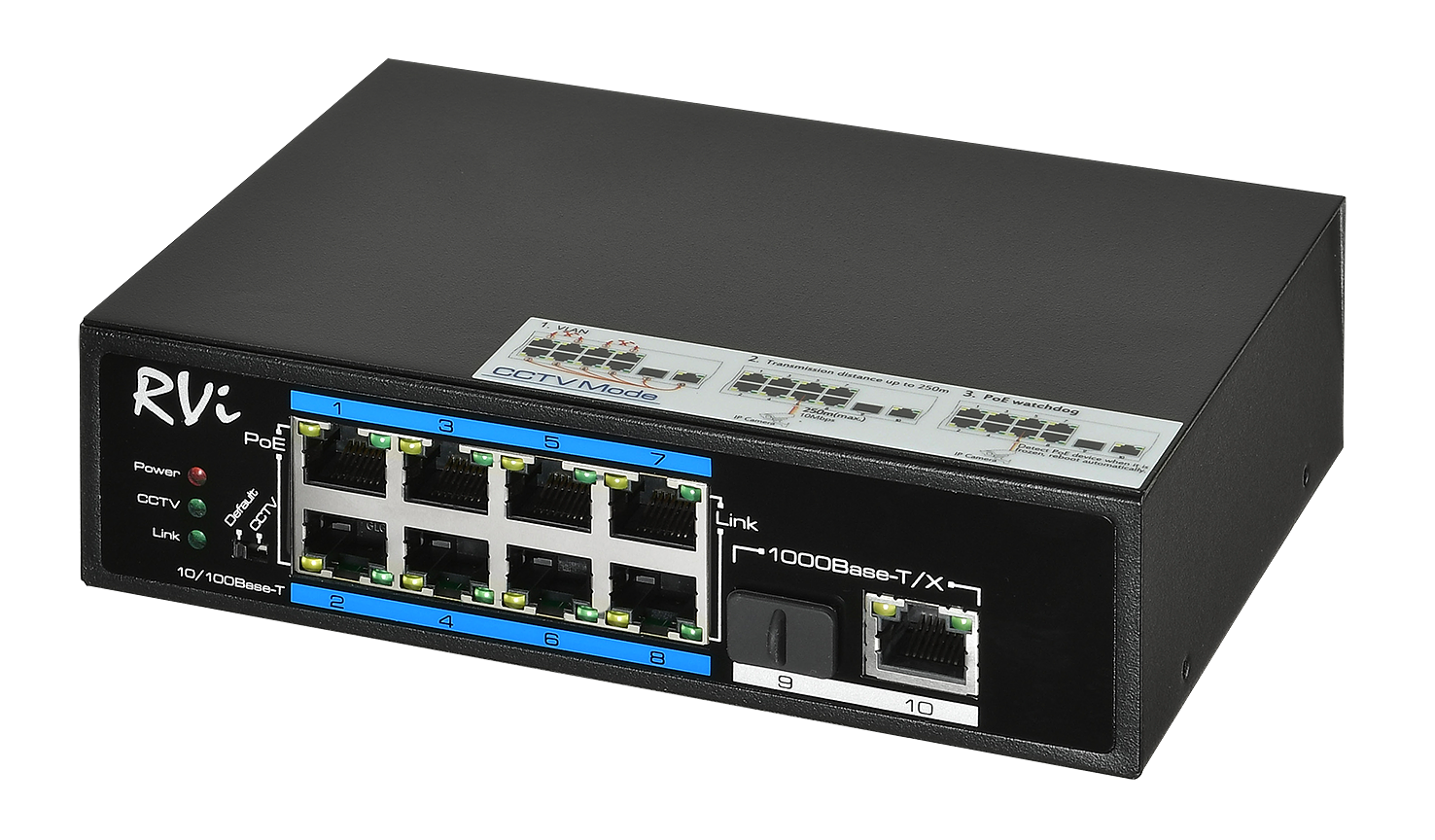 Сетевой коммутатор; Общее количество портов: 10 , Количество портов, поддерживающих стандарт PoE: 8 шт., 1 порта 10Base-T/100Base-TX/1000Base-T; 1 порт 1000BaseSX/LX; Суммарная мощность потребителей: 120 Вт; Максимальная мощность на порт: 30 Вт; Таблица МАС адресов: 8К; Габаритные размеры: 159(Д)х110(Ш)х44(В) мм; Вес: 500 г;