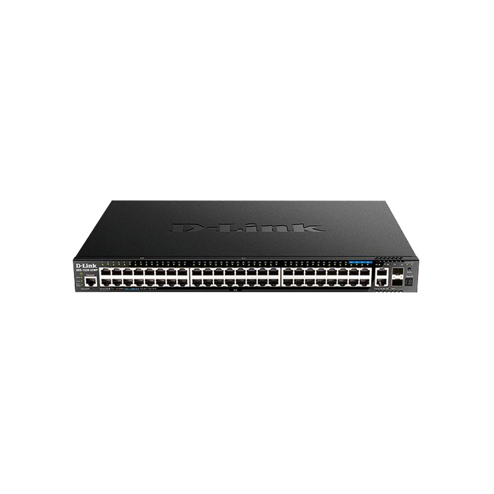 Управляемый коммутатор D-Link DGS-1520-52MP/A1A оборудован сорока восемью портами RJ-45 с PoE — сорока четырьмя гигабитными, четырьмя 2.5-гигабитными; четырьмя 10-гигабитными: двумя RJ-45, двумя SFP; консольным RJ-45.