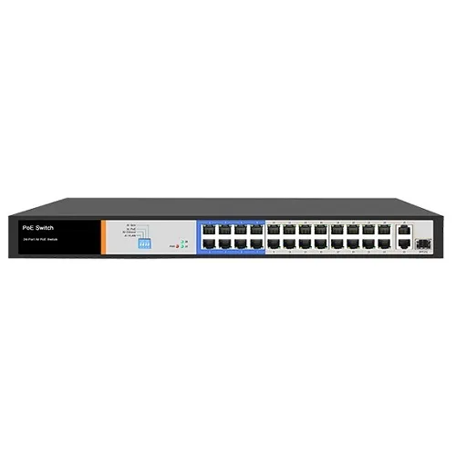 * Порты: 24 порта 10/100Mbps PoE RJ45, 2 порта 10/100/1000Mbps RJ45, 1 порт 10/100/1000Mbps SFP.