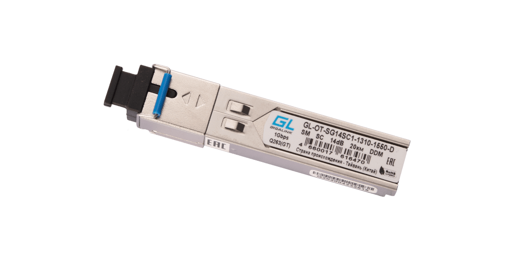 Модуль GIGALINK SFP, 1.25 Гбит/с, WDM, 1 ОВ, SM, 1xSC, Tx:1310/Rx:1550 нм, DDM, 14 дБ (до 20 км)