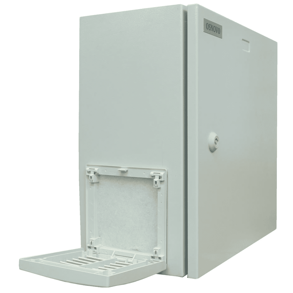 * Система проточной вентиляции: Включает вентилятор, срабатывающий по сигналу отдельного термостата (Н-З, от +35 ºС), и два сетчатых фильтра на притоке и вытяжке воздуха. Предотвращает перегрев оборудования (выше 50 ºС) и защищает от попадания пыли.