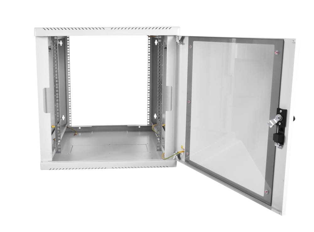Шкаф отличается высокой жесткостью конструкции, благодаря усиленным элементам крепления. Дверь открывается на 180° и снабжена универсальной навеской и усиленным точечным замком с поворотной ручкой. Направляющие имеют юнитовую маркировку. Перфорация сверху и снизу обеспечивает естественную вентиляцию. В крыше и основании предусмотрены заглушенные посадочные места для установки вентиляторных модулей.