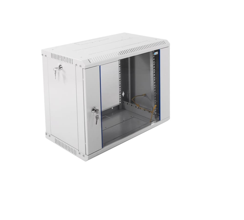Шкаф состоит из каркаса, крыши и основания, боковых стенок с вертикальными монтажными профилями, передних монтажных профилей и цельнометаллической двери с точечным замком.