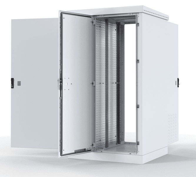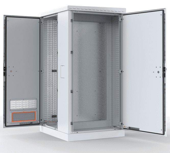 Шкаф состоит из двух секций: телекоммуникационной и электротехнической. В передней двери предусмотрены места для установки обогревателя, вентиляторного модуля или кондиционера. В шкафу установлены две DIN-рейки для монтажа электрооборудования. Телекоммуникационную секцию можно разделить на две части с помощью полки (не входит в комплект). Заднюю дверь можно заменить полкой (также не входит в комплект).