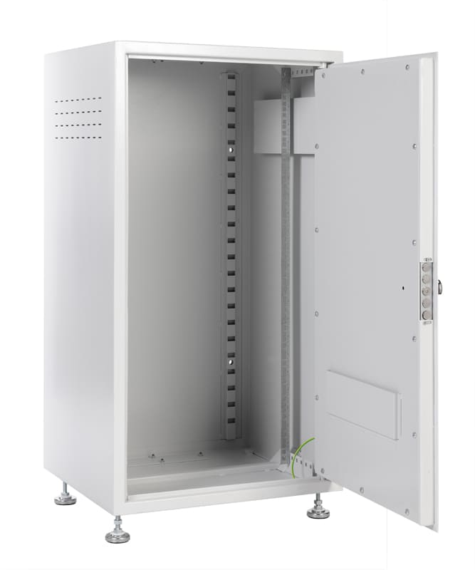 Цельнометаллическая сварная конструкция изготовлена из оцинкованной листовой стали толщиной 2 мм. Дверь с тремя точками фиксации (в закрытом положении) углублена на 20 мм, укомплектована усиленным ригельным замком. Предусмотрена дополнительная фиксация шкафа к стене — через отверстия в задней панели.