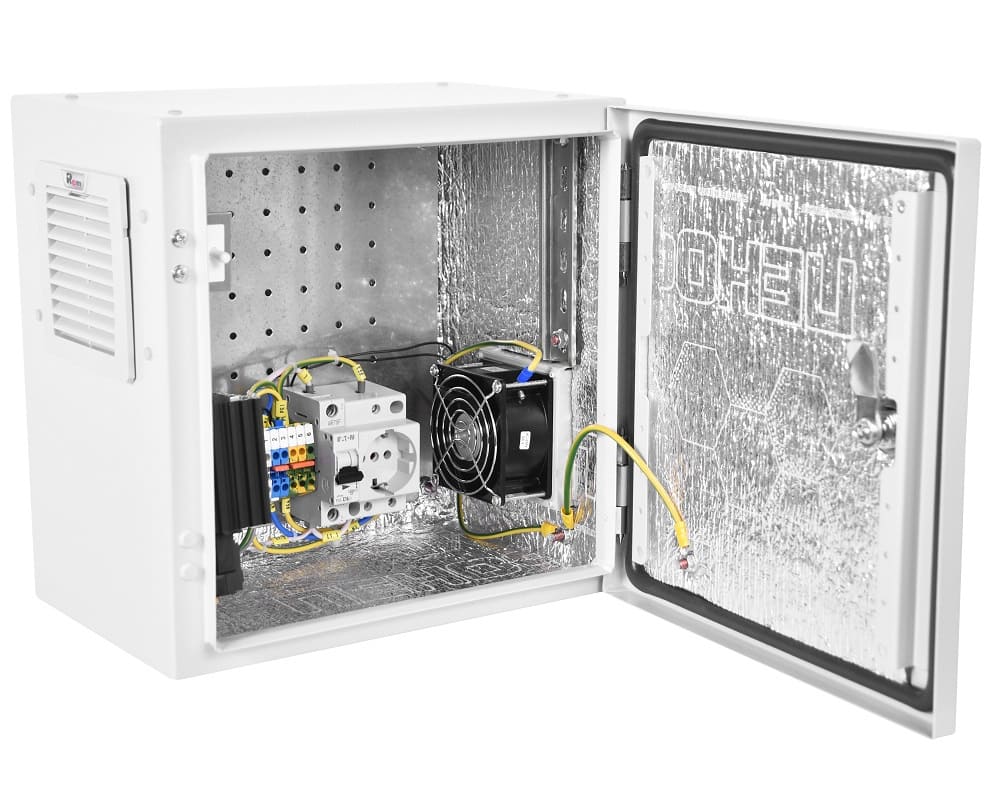 Термоизоляция и климат-контроль: Внутренняя термоизоляция, обогреватель и вентиляторный модуль поддерживают оптимальную температуру внутри шкафа, предотвращая перегрев или переохлаждение оборудования.