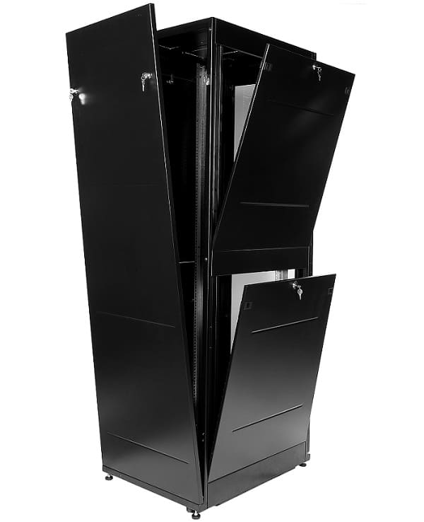 Конструкция шкафа выполнена на основе сварного каркаса из стальных профилей, обеспечивающего высокую жесткость. Шкаф оснащен крышей, основанием, боковыми и задней панелями, а также дверью с ударопрочным стеклом. Съемные боковые стенки, дверь и задняя панель обеспечивают доступ к оборудованию со всех сторон.