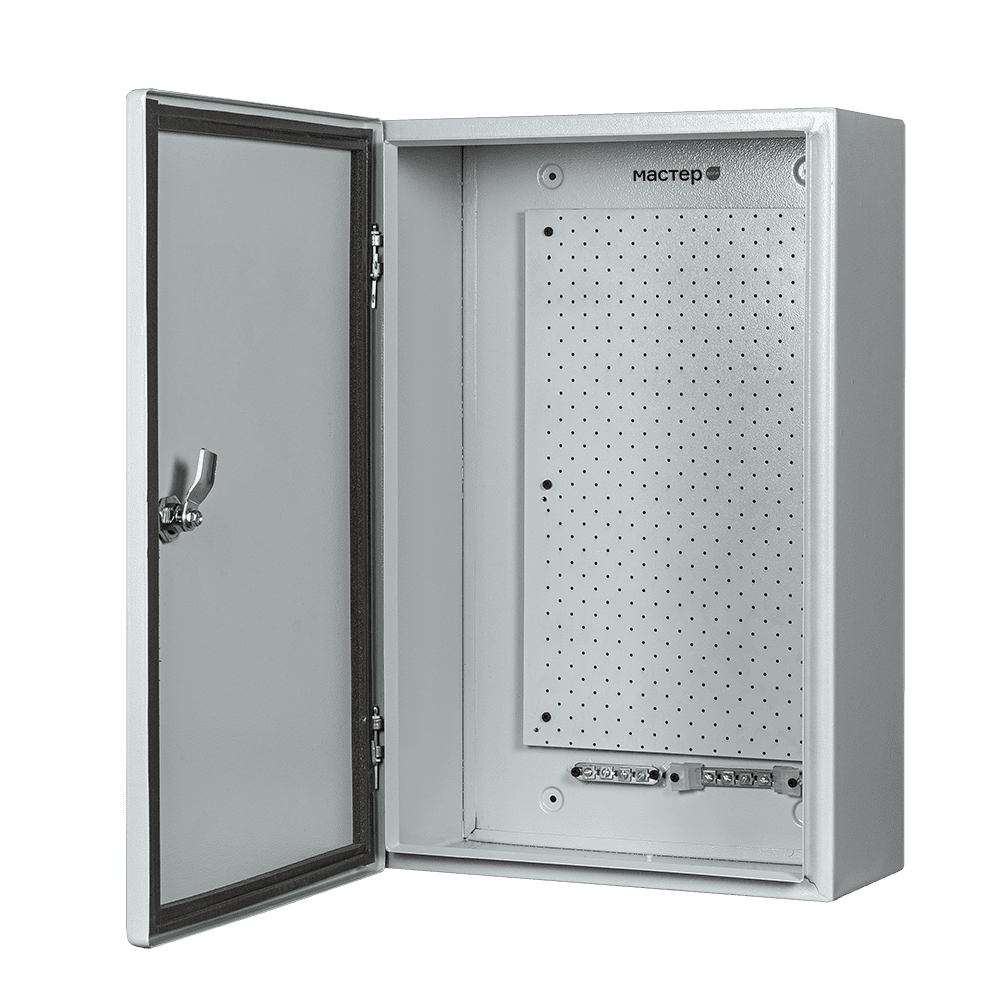 Электротехнический шкаф Mastermann «Мастер 3 У» изготовлен из листовой стали марки Ст3 толщиной 1.2 мм (1.5 мм — с покрытием). Состоит из сварного корпуса и рамы с дверью. В основании корпуса предусмотрено два отверстия для кабельных вводов (два гермоввода MG-25 с каучуковой мембраной — в комплекте), по периметру проема — металлический воротник, по периметру двери — резиновый уплотнитель, на задней стенке — две клеммные колодки.