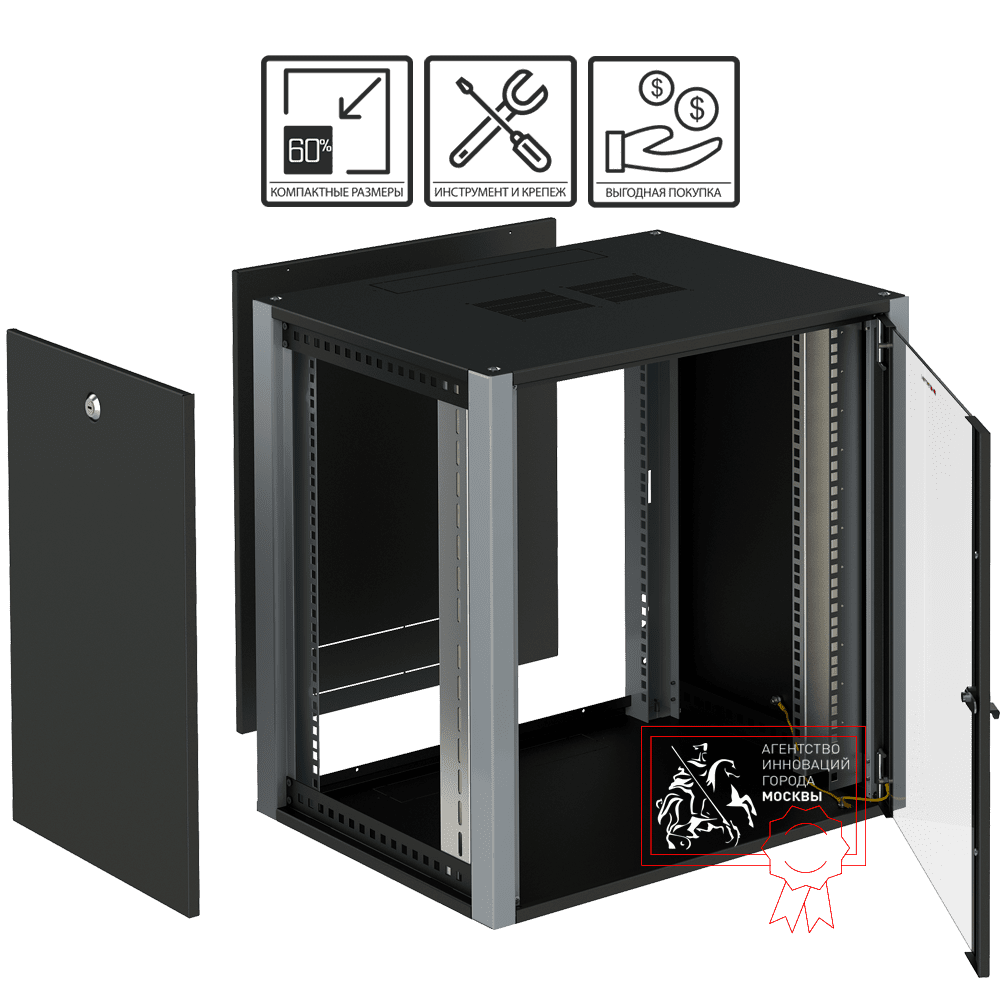 Листовые детали шкафа покрыты предварительно фосфатированной полимерной порошковой краской. Цвет листовых деталей - сигнальный черный (RAL 9004), стоек - "серая белка" (RAL 7000). Монтаж универсальный. Степень защиты IP20.