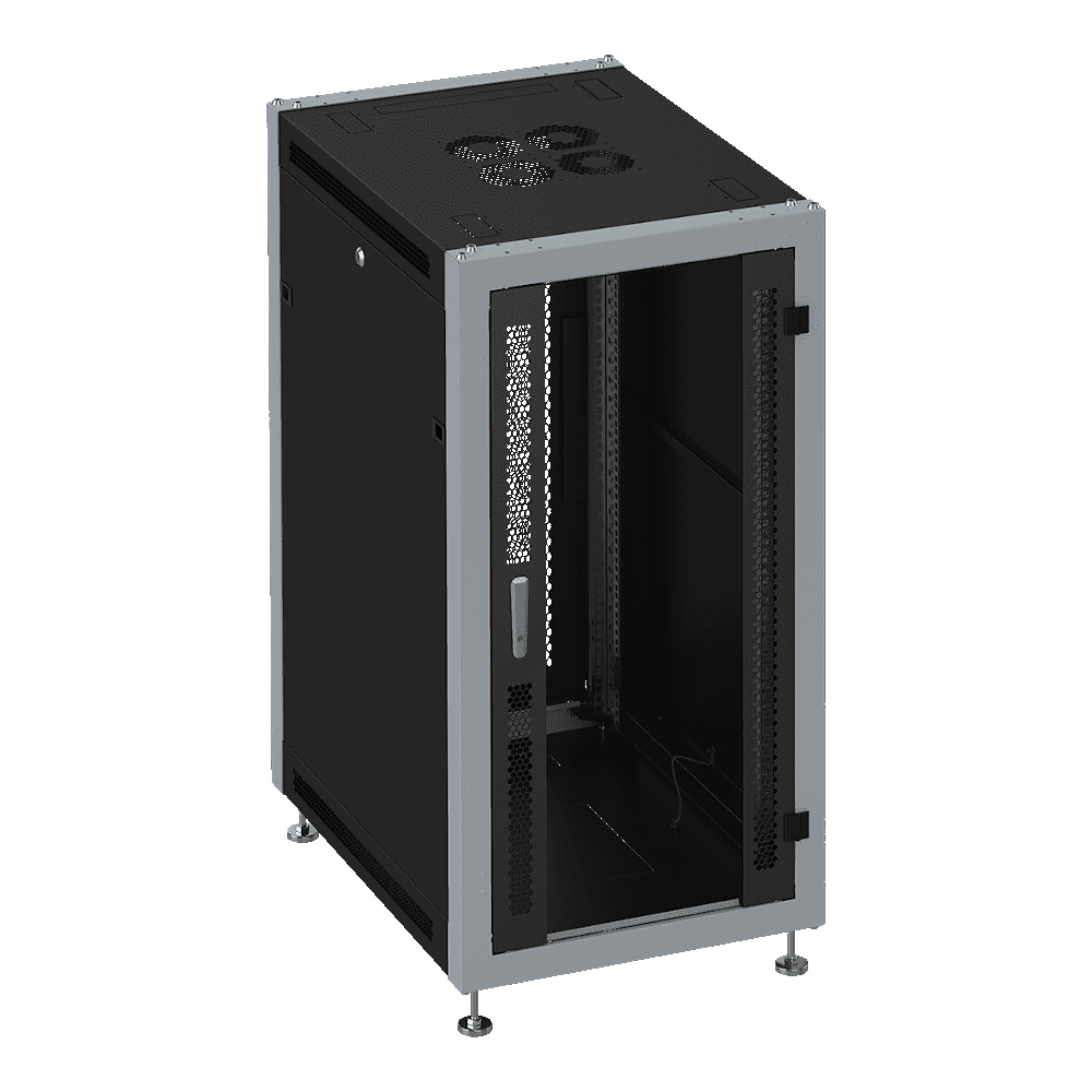 Удобство обслуживания: Две двери (передняя стеклянная и задняя двухстворчатая перфорированная) с замками и поворотными ручками обеспечивают легкий доступ к оборудованию.