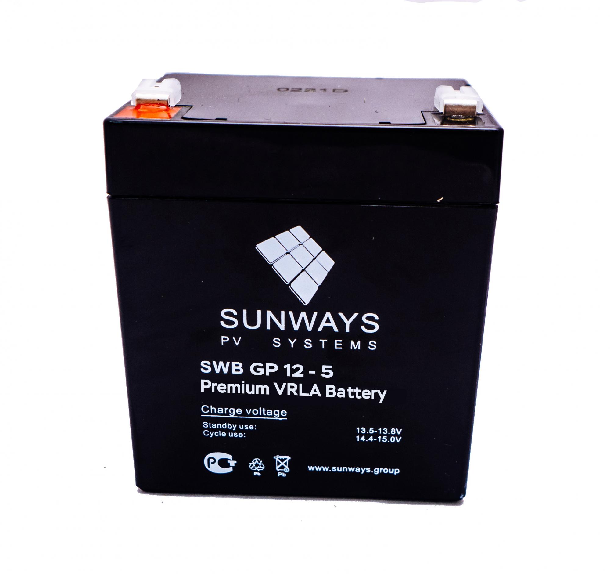 Аккумуляторные батареи Sunways серии GP являются универсальными и предназначены для работы в охранных, пожарных, солнечных энергосистемах, системах бесперебойного питания и ветрогенераторных установках. Корпус таких батарей полностью герметичен и выполнен из негорючего ABS пластика, что исключает возможность выделения кислотных паров и водорода. Это позволяет отнести батареи к необслуживаемым и эксплуатировать их внутри жилых и офисных помещений. При производстве аккумуляторов применена технология AGM (Absorbed Glass Mat). Они предназначены для работы как в циклическом, так и буферном режиме. Аккумуляторные батареи серии GP – одно из лучших предложений на рынке благодаря продолжительному сроку службы (10 - 12 лет), улучшенным зарядным характеристикам, абсолютной герметизации корпуса и доступной цене.