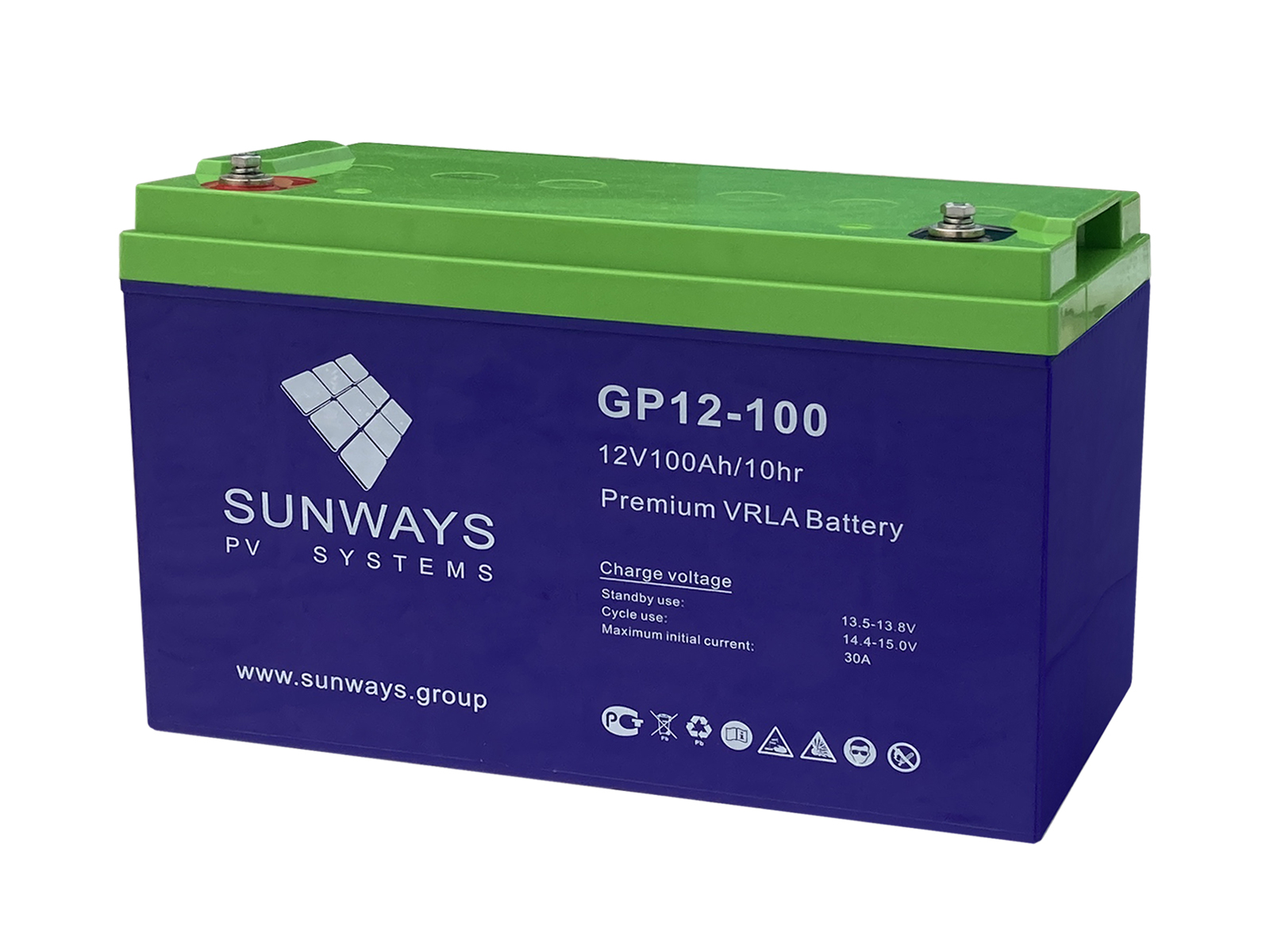 Аккумуляторные батареи Sunways серии GP являются универсальными и предназначены для работы в охранных, пожарных, солнечных энергосистемах, системах бесперебойного питания и ветрогенераторных установках. Корпус таких батарей полностью герметичен и выполнен из негорючего ABS пластика, что исключает возможность выделения кислотных паров и водорода. Это позволяет отнести батареи к необслуживаемым и эксплуатировать их внутри жилых и офисных помещений. При производстве аккумуляторов применена технология AGM (Absorbed Glass Mat). Они предназначены для работы как в циклическом, так и буферном режиме. Аккумуляторные батареи серии GP – одно из лучших предложений на рынке благодаря продолжительному сроку службы (10 - 12 лет), улучшенным зарядным характеристикам, абсолютной герметизации корпуса и доступной цене.