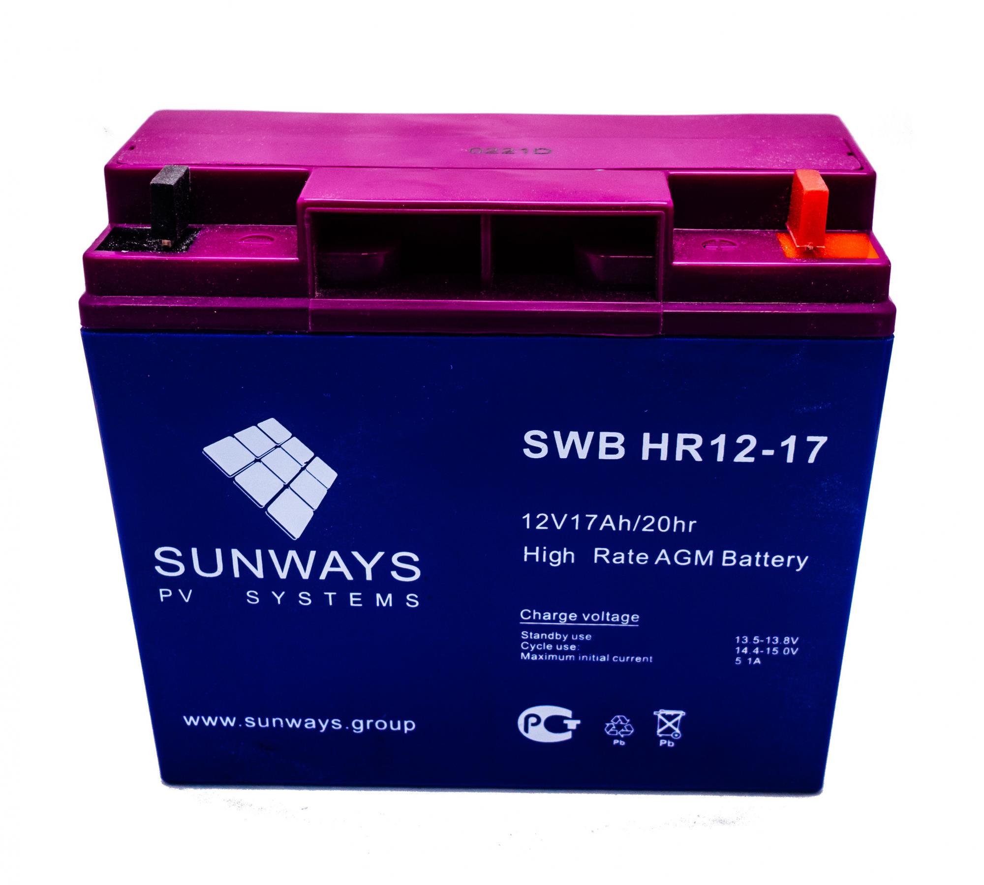 Аккумуляторные батареи повышенной мощности Sunways серии HR (High Rate) созданы для использования в охранных, пожарных, солнечных энергосистемах, системах бесперебойного питания и ветрогенераторных установках. Корпус этих АКБ выполнен из негорючего ABS пластика и полностью герметичен, это исключает возможность выделения кислотных паров и водорода. Таким образом они относятся к необслуживаемым и разрешены к использованию внутри жилых и офисных помещений. Аккумуляторы выполнены по технологии AGM (Absorbed Glass Mat) и предназначены для работы как в циклическом, так и буферном режиме. Продолжительный срок службы (10 - 12 лет), улучшенные зарядные характеристики, абсолютная герметизация корпуса и доступная цена, делает аккумуляторные батареи серии HR одним из лучших предложений на рынке.